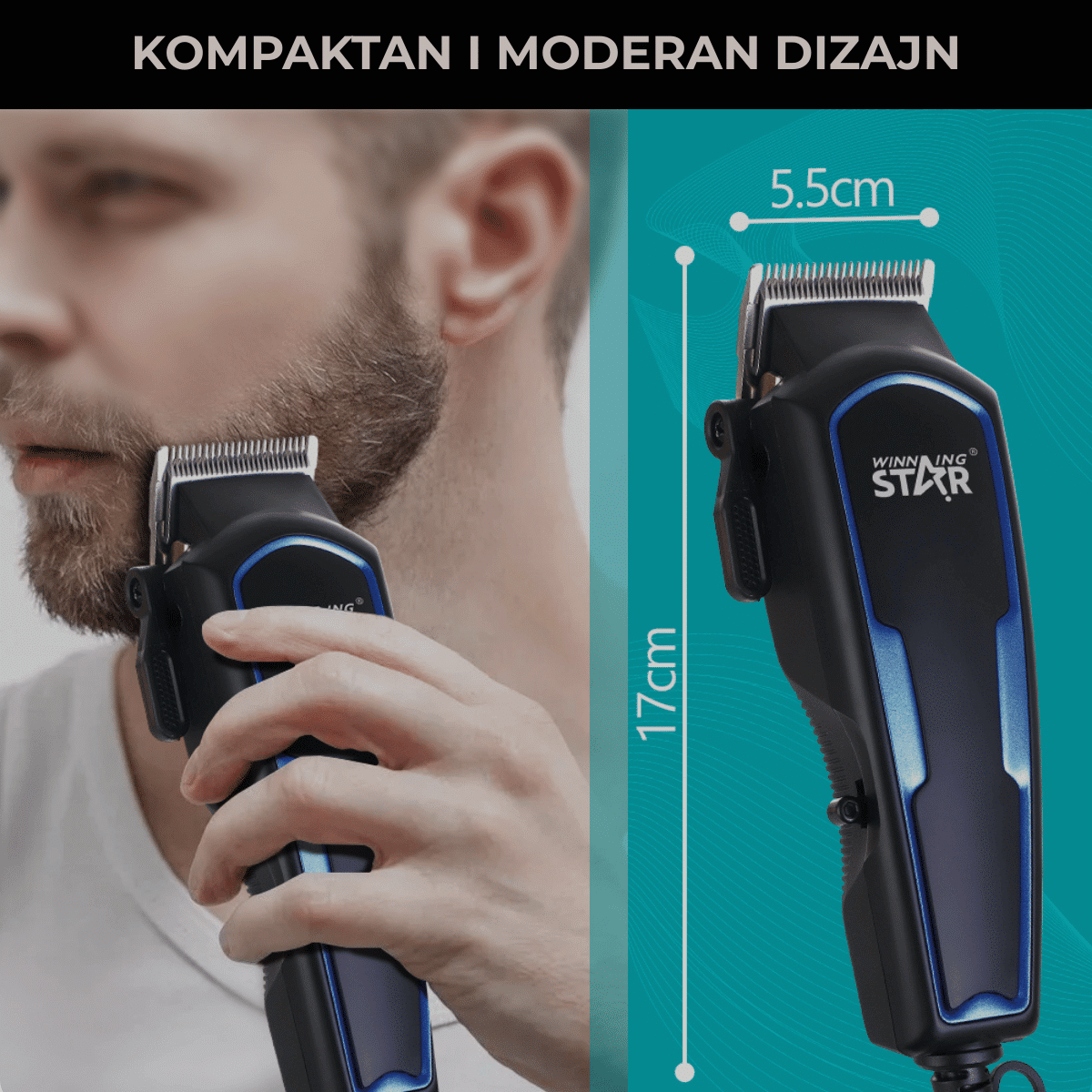 Winning Star je napravljen da izdrži svakodnevnu upotrebu. Kompaktne dimenzije (170 x 50 mm) i balansirana težina omogućavaju stabilnost u ruci, smanjujući zamor zgloba. Kabal dužine 1.9 metara pruža vam dovoljno prostora da se slobodno krećete oko stolice, baš kao u profesionalnom frizerskom salonu.